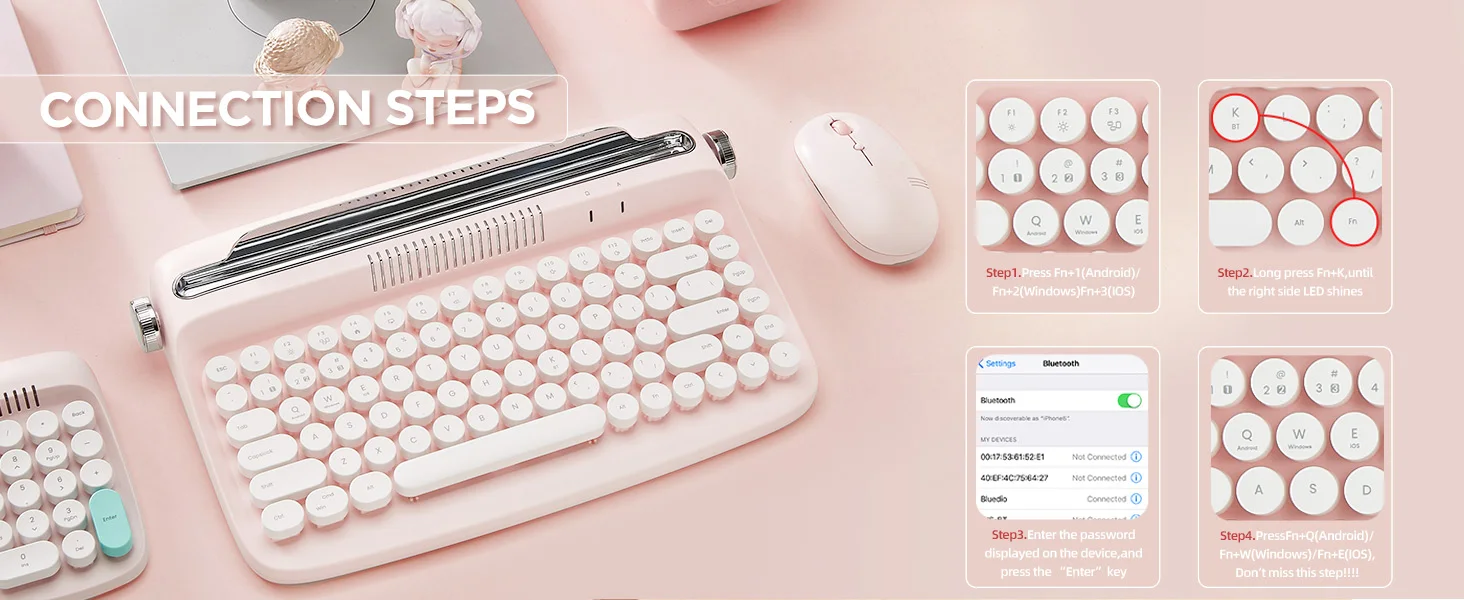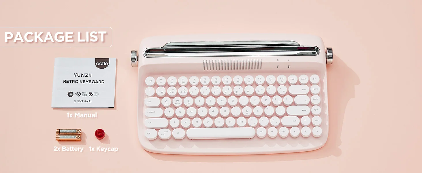 The wireless office retro keyboard connects via Bluetooth on Windows, Android, or iOS systems, and supports all kinds of devices including Pad/PC/Laptop/Tablet/Smartphone. The package includes a retro wireless keyboard, an extra red keycap, 2 AAA batteries, manual.