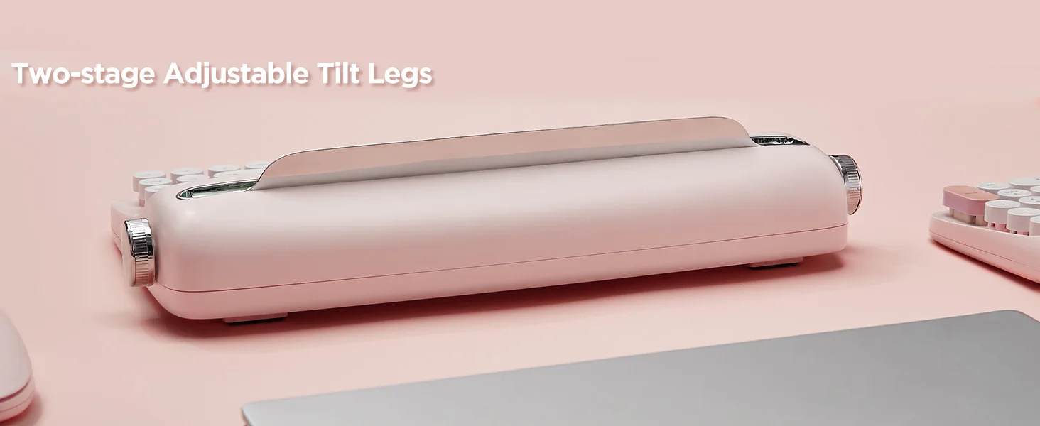 The YUNZII B303 wireless typewriter keyboard includes an integrated stand holder for a pad, phone, and tablet, which matches the aesthetic of your desk and saves space. The wireless mini compact also includes adjustable feet, allowing you to set the angle for maximum comfort during long typing sessions. The built-in tablet or phone holder is 12.9 inches long and 0.59 inches wide.