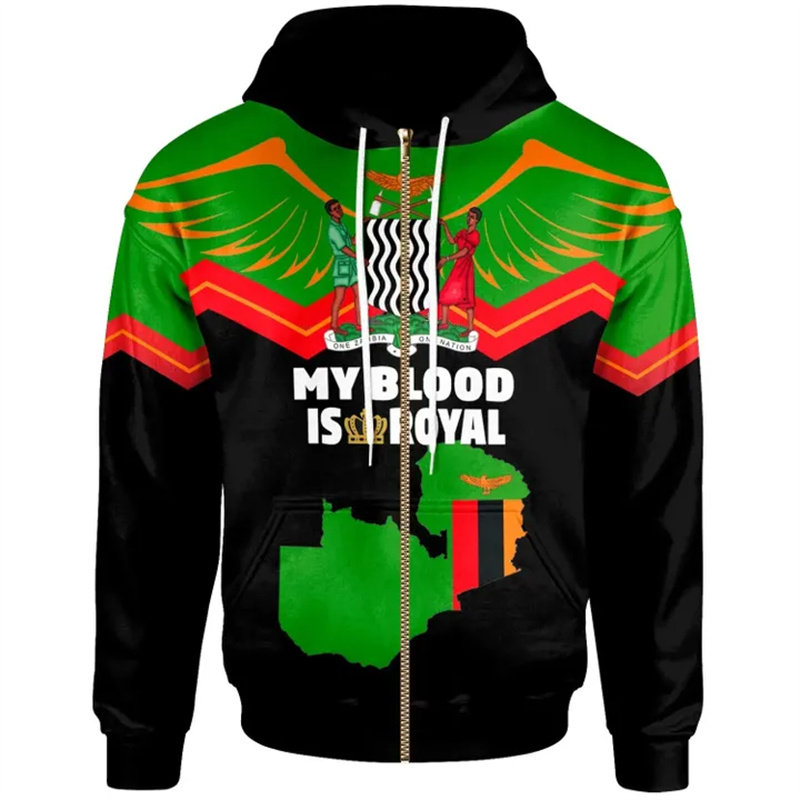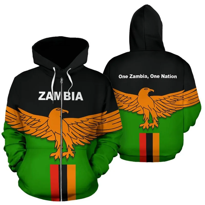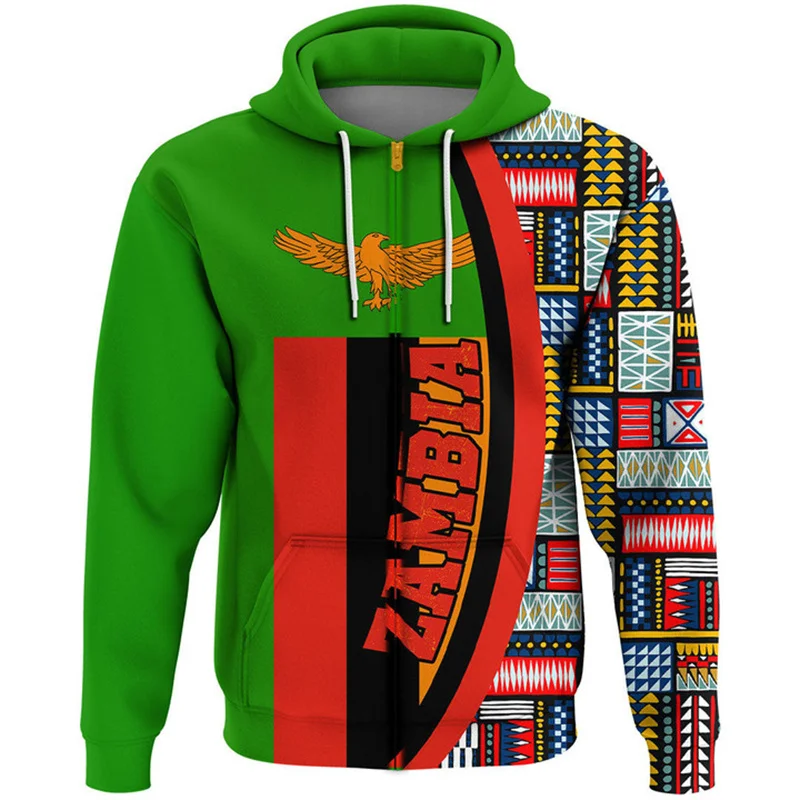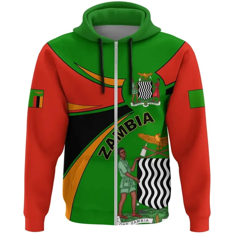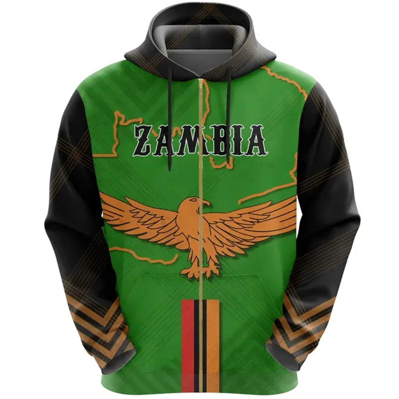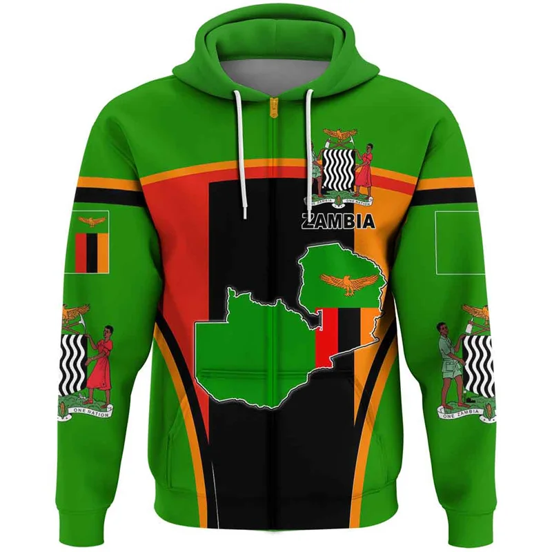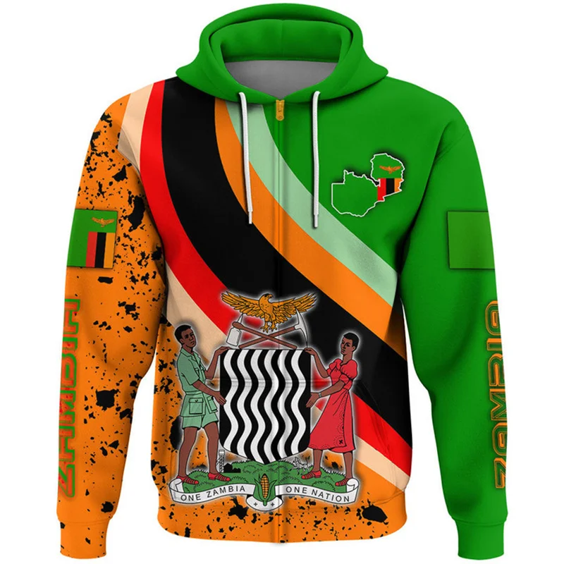 Zambia Flag Graphic Hooded Sweatshirts For Men National Emblem 3D Print Hoodies Autumn Loose Sports Long Sleeve Zipper Pullover