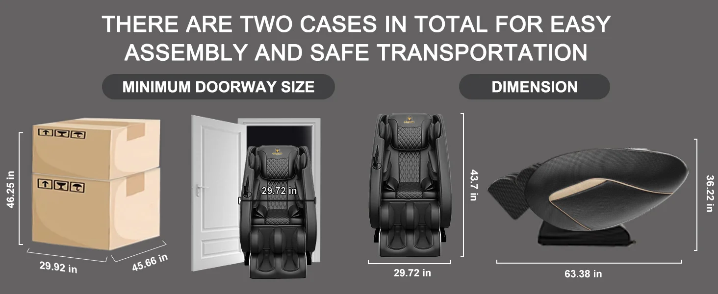 Smart Packaging:To ensure safe and easy transport, the massage chair is shipped in two separate boxes. This reduces the overall size and weight of each package, minimizing the risk of shipping damage and making handling more convenient.