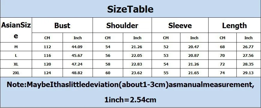 | Size:XL | Bust:120cm/47.24” | Shoulder:58cm/22.83” | Sleeve:54cm/21.26” | Length:72cm/28.35” |